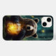 Urso negro grande numa floresta escura com um vidro cheio de pirilampos.