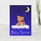 Um ursinho bonitinho segurando uma caixa de presentes está sentado em uma nuvem em frente a um céu azul noturno com estrelas brilhantes.