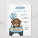 Garoto Chá de fraldas com Urso Bebê em Carro Azul e balões para uma celebração de chá de fraldas (ideia de excelente para o tema do chá do urso Teddy).