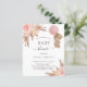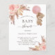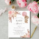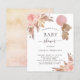 Para um chá de fraldas moderno estilo boho. Fundo branco na frente. Decorado com ouro rosa e flores cor-de-rosa, rosas, grama-pampas e ursinha-peluche segurando um balão rosa. Personalize e adicione um nome e detalhes da parte. Fundo: Um fundo metálico rosa dourado, pincelado, pincelado, pincelado, falho rústico e roxo.