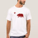 Uma silhueta de marrom (vermelho escuro) de um urso pardo e estrela solitária contra uma camiseta escura.