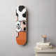 Pão de skate de vaca. Design apresenta uma embaraçosa vaca branca e preta sobre um fundo laranja. Design © Lisa Marie Robinson