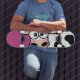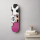 Pão de skate de vaca. Design apresenta uma embaraçosa vaca branca e preta em fundo rosa. Perfeito para patinadores de meninas. Design © Lisa Marie Robinson
