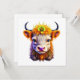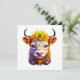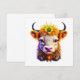 Uma vaca bonita de terras altas com uma flor amarela no cabelo. Vazio para enviar a um amigo.