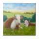 Design original das belas artes de uma vaca de Hereford e de sua vitela pelo artista Carolyn McFann do estúdio de ronrom de dois gatos em um azulejo da qualidade para fãs bovinos.