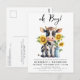 Convide seus amigos e família para comemorar a chegada do seu novo bebê com este adorável bezerro de leite e flores do sol convites para chuveiros de bebês, acessórios de festas e presentes. Este convite para chás de fraldas apresenta uma vaca a cores-d'água pintada à mão, perfeita para amantes de fazendas e vacas! A design é moderna e moderna, com um simples esquema de cores preto branco e amarelo e o texto "oh Boy" pode ser personalizado para oh Baby for a baby boy or girl. COPYRIGHT © 2023 Judy Burrows, Black Dog Art - Todos Os Direitos Reservados. Vaca Cótea Girassóis Chá de fraldas moderno Convite postal