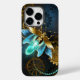 Vagalume steampunk com asas transparentes azuis e lâmpada verde em um fundo marrom desgastado e texturizado. Estilo steampunk.