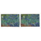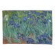 Este belo produto é inspirado por "irrises" pintados por Vincent van Gogh em 1889. A imagem apresenta riscas azuis com caules verdes e folhas com pontas pontiagudas plantadas em terra vermelha-marrom.