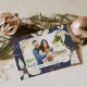 Mande cartões de natal para amigos e família em estilo chic com nossos cartões com fotos elegantes. Sua foto está bordada em branco, sobre um fundo azul marinho enfeitado com flores de baunilha cremosas e bagas vermelhas. Personalize com sua saudação personalizada (mostrada com "desejos calorosos") e seu nome de família ou nomes individuais.