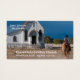 Modelo de cartão de negócios do templo ocidental com um vaqueiro andando a cavalo em direção a uma velha igreja branca. Personalize o texto. Esta placa também está disponível em um casal de diferentes versões com e sem impressão na parte traseira. Veja mais no Rodeo Days Store em Zazzle.