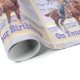 O vaqueiro no cavalo que sustenta uma bebida como um brinde com texto que lê aqui é-lhe…. Em seu aniversário