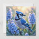 Um lindo notecard de vazio temido por pássaros. Frente tem uma ilustração ai de um bonito Blue Jay sentado em um galho lilás.