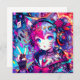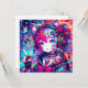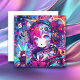 Anime glitchcore girl dando um sinal de paz com fones de ouvido, notas musicais e orelhas de raposa coloridas, roxa, azul e negra, arte ai.