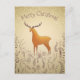 Cartão de Natal com veado rodeado de folhagem e flocos de neve. Texto opcional no verso com endereço de retorno para fácil envio.