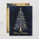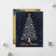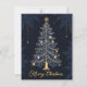 Este cartão de Natal, maravilhosamente desenhado, apresenta uma elegante árvore de Natal decorada com ornamentos e luzes de ouro, revestida com uma estrela brilhante ouro. A árvore é destacada contra um fundo escuro com padrões sutis de folha e estrelas pequenas ouros penduradas ao seu redor. No final, "Feliz Natal" é escrito em um roteiro elegante de ouro. A frente do cartão capta o espírito festivo com sua intrincada e festiva design. No verso, a placa apresenta uma página de vazio ao estilo vintage com flocos de neve decorativos, fornecendo amplo espaço para escrevendo uma mensagem pessoal e sincera. Perfeito por enviar desejos de férias calorosos para os entes queridos.