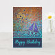 Um veleiro cavalgando as ondas sob um céu coberto de sol. A água e as ondas são azuis claro e escuro com reflexões do céu colorido. O céu está cheio de blues, amarelos, laranjas e vermelho. O gráfico tem uma aparência de metal brilhante. Feliz Aniversário está sob o gráfico em azul claro contra um fundo azul escuro. A dentro do cartão diz: "Que seus anos sejam preenchidos com dias felizes. Feliz aniversário!"