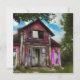 Uma casa de celeiro abandonada e decapitada cercada por árvores. O Windows está chegando. Vermelho e rosa. Postar apocalíptico.