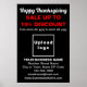 Feliz Dia de Ação de Graças! Um feriado para comemorar e obrigado pelas bênçãos que recebemos. É também um dos feriados para anunciar a sua empresa. Poster personalizável com venda de Ação de Graças, seu nome de negócios e outras informações. Poster que você pode usar como material de marketing para atrair mais clientes. Personalize-o e use-o para convencer mais clientes a comprar de seus produtos ou clientes a gostar de seus serviços no Dia de Ação de Graças. As cores design são textos vermelhos e brancos sobre fundo preto. O conteúdo é saudação Feliz de Ação de Graças, textos de venda com desconto percentual que você oferecerá, datas de venda, seu nome comercial, logotipo, endereço, número de telefone, e-mail e site ou sua página de mídia social de negócios. Verifique a aparência após carregar o logotipo e digitar textos. Se a aparência lhe agrada, você pode colocar seu pedido agora. Se você precisar redimensionar e mover o logotipo e os textos para o ajustado neste poster ou no tamanho e forma que você escolherá, mude na ferramenta design. Você também pode fazer outras alterações na ferramenta design de acordo com a aparência deste poster, que você prefere, como alterar a cor do fundo, a cor da fonte e o estilo da fonte. Feliz Dia de Ação de Graças! Desejando mais vendas neste feriado.