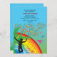 Um convite colorido para uma festa de aniversário de casa. Apresenta um arco-íris, pássaros, folhagem e abstrato, espirros contra fundo azul. Perfeito para uma celebração ao ar livre.O cartão é fácil de personalizar com seu texto, fonte, cor da fonte e escolha de seis tipos de papel.