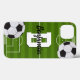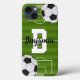Esta capa de telefone personalizada tem fãs de futebol design com campo de futebol e duas bolas ilustradas. Personalizou esta capa de telefone com um primeiro ou sobrenome e um inicial. Um presente esportivo personalizado para dar ao fã de futebol na sua vida que joga cartas.