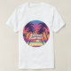 Uma cena de praia estilo retrô sem camiseta de Verão com palmeiras, um céu com gradiente de sol, e texto "Verão sem fim", cores de onda vaporonave, estética de poster de surf de de colheita.