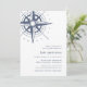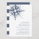 O convite para chá de fraldas chic costeiro apresenta uma ilustração de rosa de bússola náutica desenhada manualmente em azul-porto, com os detalhes do seu chá de fraldas em azul-marinho clássico. Perfeito para chás de fraldas de praia, verão ou temas náuticos, esses convites de estilo costeiro se revertem para amplas faixas horizontais em azul e branco do porto.