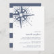 O convite para janto de ensaio técnico costeiro apresenta uma ilustração de rosa de bússola desenhada manualmente, com os detalhes do seu janto de ensaio em azul-marinho clássico. Perfeito para praia, verão, ou ensaios e celebrações náuticas, esses convites de estilo costeiro se revertem a grandes faixas azuis e brancas.