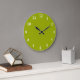 Bonito relógio da parede da cozinha de um verde brilhante conhecido como limeada. Doze números brancos sobre fundo azul comum. Adição perfeita para uma cozinha com esquema de cor verde