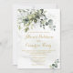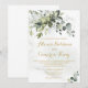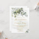 Este convite de casamento apresenta folhagem verde, texto elegante de ouro com fundo de aquarela.