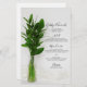 Personalize o Menu de Casamento Verde Natural sobre Branco com os detalhes da refeição que você servirá no almoço de chá de panela da sua festa de jardim bonito, poste o brunch de casamento ou o janto de recepção de casamentos, adicionando a salada ou o primeiro curso, a entrada ou o segundo curso e a sobremesa ou o terceiro curso. Personalize-o com os nomes da noiva e noiva, local de evento e data. Este elegante cardápio de casamento personalizado apresenta uma fotografia natural de uma garrafa de leite de vidro vinda cheia de folhagem verde e folhas com seda branca.