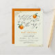 Está a caminho um pouco de gracinha! Celebrar a futura mãe com esta design com aquela frase em letras elegantes, com laranjas pintadas à mão e folhas verdes sobre um fundo verde pastel. Os detalhes do seu chá aparecem abaixo na tipografia moderna. Há brilho dourado nos cantos superior esquerdo e inferior direito.