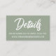 Mantenha os seus convidados em contato com todos os seus detalhes relacionados ao casamento com estes cartões de inserção bonito e abrangentes. Estes cartões bonito refletem um estilo elegante e casual. As sobreposições de texto elegantes foram projetadas usando uma fonte moderna, ousada, casual; um lado lê "Salvar a Data" e o outro, simplesmente diz "Detalhes". Use os campos modelo para personalizar essas placas de gabinete com suas informações pessoais. Impresso com a "tecnologia de cartão de visita", o tamanho útil será fácil de manter à mão. Envie-os por e-mails tradicionais, e guarde alguns por perto para compartilhar com aqueles que precisam de um ou dois extras! O fundo está coberto num elegante verde mutado e esta cor editável pode ser alterada para qualquer matiz da paleta de casamento que você escolher; todo o texto é branco. // 89 // Concebida por Melody Watson para Paper Muserie.