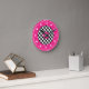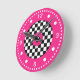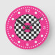 Este relógio tem um fundo de prancheta preto-e-branco com um círculo rosa quente no centro e um anel rosa quente ao redor da borda com pontos e números brancos.