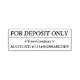Este design de carimbo tradicional contém a mensagem "SOMENTE PARA DEPÓSITO", além de um nome pessoal/profissional personalizado e de um número de conta. Talvez possa ser usado por um funcionário de escritório, um operador de pequena empresa ou um indivíduo para rapidamente adicionar um despejo restritivo a um cheque.
