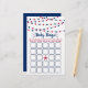 Estas cartas de bingo são perfeitas para qualquer um que tenha um chá de fraldas este ano. O design apresenta luzes de cordas penduradas, brancas e azuis, patrióticas, vermelhas e azuis, e palavras de modelo. Basta incluir esses cartões de bingo quando você enviar seus convites de chuveiros de bebê correspondentes, seus hóspedes podem então preencher cada quadrado com qualquer presente que eles pensam que o bebê receberá no chá, cinco em qualquer direção ganham um prêmio!
