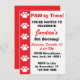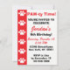 Este convite exibe uma faixa vermelha com as impressões de pata branca e o texto "Hora da PÁGINA! Você é convidado para comemorar..." Estes são excelentes de convites para impressão de pata temidos, temidos de cachorro, temedados de cachorro, temedinhos de gato ou festas de aniversário de animais para crianças.