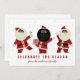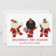 Papais noeis pretos, bonitos e dançantes fazem uma ilustração divertida neste cartão de Natal com um fundo branco. Diversão, bobo e design original que promove a diversidade durante a temporada de férias.