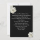 A cetim vermelha parece fundo com a borda preta. Flores de seda brancas adornadas com brilhantes diamantes decoram cantos em frente e atrás. Personalize o texto e a fonte para se adequar. TODOS OS ELEMENTOS SÃO IMPRESSOS