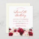 Rosas vermelhas e peônias cor-de-rosa-claro estão aninhadas em folhas verdes-escuras neste belo e único convite de aniversário.