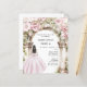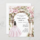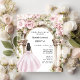 Um grande arco de mármore decorado com flores cor-de-rosa. Uma garota com um vestido de rosa claro. Personalize e adicione um nome e detalhes. 1 folha = 1 convite impresso de borda a borda.