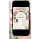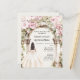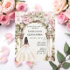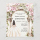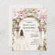 Um grande arco de mármore decorado com flores cor-de-rosa. Uma garota com um vestido branco. 1 folha = 1 convite impresso de borda a borda.
