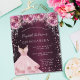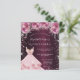 Um convite moderno, na moda e glamouroso para uma Quinceañera, festa de aniversário 15. Um fundo metálico burgundo e pouco elegante, com poeira brilhante rosa, um vestido e flores cor-de-rosa. O nome é escrito com um moderno estilo escrito à mão. Personalize e adicione os detalhes da sua festa.