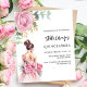 Um convite moderno, na moda e glamouroso para uma Quinceañera, festa de aniversário 15. Um fundo branco decorado com uma rosa grande rosa, uma garota vestindo um vestido de bola. O nome é escrito com um moderno estilo escrito à mão. Personalize e adicione os detalhes da sua festa. 1 folha = 1 convite impresso de borda a borda.