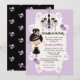 Convites de chá de panela púrpuros, lavandas e góticos pretos são perfeitos para um chá de panela ou festa de solteira do Halloween. Seus hóspedes ficarão encantados em receber esses convites super fofos de chás de casamento de temas góticos com um elegante candelabro e roxo e uma linda gótico com batom preto e sombra de lavanda vestindo um anel de noivado ametista em um vestido de noiva gótico com um topo roxo. Rosas e flores adicionam um toque bonito e gótico ao trabalho de arte. Um padrão de repetição floral atrás. Trabalho de arte © Chrissy H. Studios, LLC. Todos os direitos reservados.