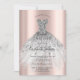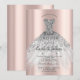 Vestido elegante de brilho prateado sobre fundo de ouro rosa.