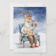 Este cartão de Natal adorável mostra um belo veado vestindo um suéter de Natal sentado numa cadeira azul na neve. No verso, há um fundo azul com neve caindo com texto que diz "Feliz Natal e Feliz ano novo" em letra escrita à mão. Personalização: você pode personalizar com seus nomes familiares e o ano