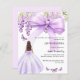 Um fundo branco elegante, decorado com uma grande lavanda, arco roxo, flores de wisteria e uma garota de vestido. Personalize e adicione um nome e detalhes da parte. 1 folha = 1 convite impresso de borda a borda.