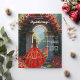 Um grande arco de mármore decorado com rosas vermelhas, flores. Uma garota com um vestido em vermelho e ouro vestindo uma tiara. Personalize e adicione um nome e detalhes. 1 folha = 1 convite impresso de borda a borda.
