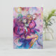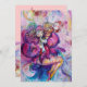 Corneta colorida, branca, rosa-rosa engraçada, tocando coruja com uma coruja expressiva e notas musicais alegres, flores, folhas em vermelho vibrante, fúcsia, violeta, roxo, azul, cores brancas, pintura aquarela de Búlgaro Lumini (c)