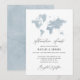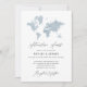 Cartão de casamento do mapa de cor azul-aquática. Com uma bela mão azul pintada aquarela mapa mundial e belo texto de roteiro. Ideal para casamentos de localização estrangeira ou amantes de viagem.